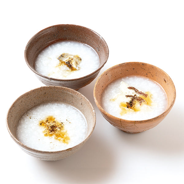 「朝かゆ」「鮑の朝かゆ」「鯛の朝かゆ」各1食入の詰め合わせ。