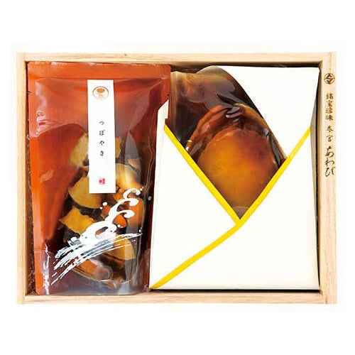 「参宮あわび姿煮小」と自然の旨みたっぷりの赤にし貝を独自の調味液でつぼ焼き風に煮含めた「つぼやき」の詰め合わせ。