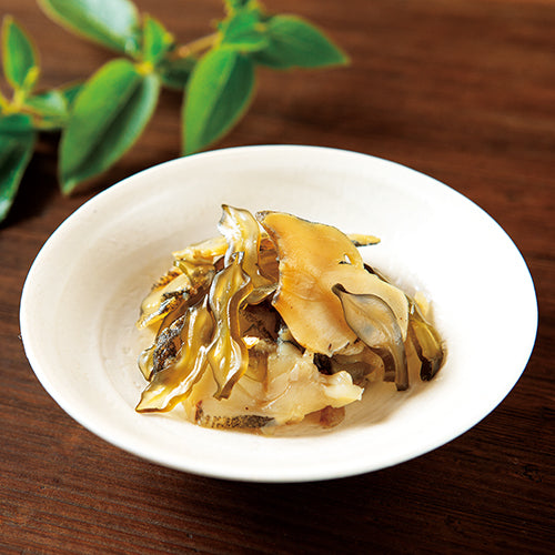 噛みごたえのある赤にし貝や、歯ざわりの良い茎わかめを薄切りにし、味付けした刻みくらげと千切り生姜をあわせ、独自の甘酢調味料で漬け込みました。