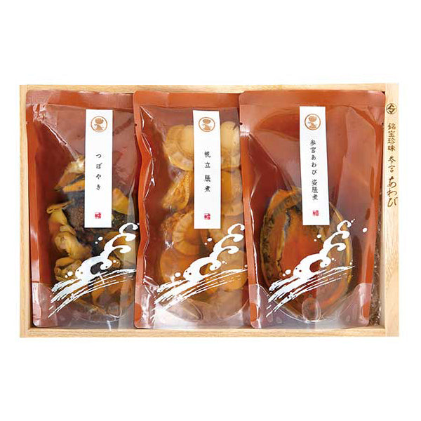 伊勢せきや自慢のたれと、脹煮の技で姿のままふっくらと柔らかく煮込んだ「参宮あわび姿脹煮」と旨み豊かな「帆立脹煮」、自然の旨みたっぷりの赤にし貝を独自の調味液でつぼ焼き風に煮含めた「つぼやき」の詰め合わせ。
