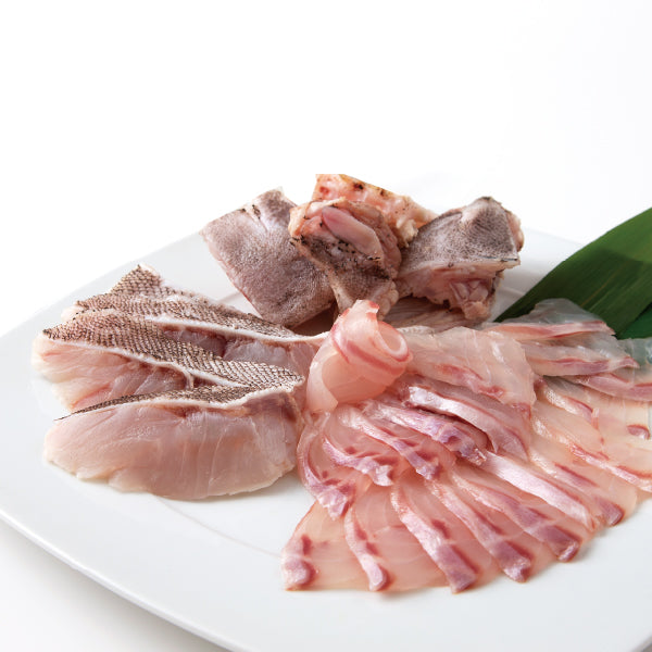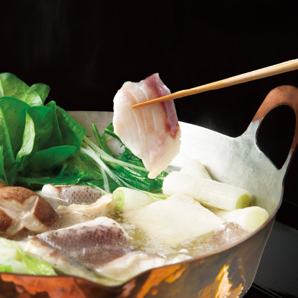 日本一の生産量を誇る三重県南部のリアス式海岸で育てられた真羽太をアラ、身、しゃぶしゃぶ用と、二人前の鍋料理に仕立て、参百年蔵謹製の「伊勢 熟成ぽん酢」とともに冷凍便でお届けします。