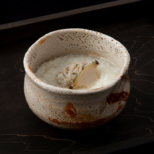 稀代の食通 魯山人先生は、生の黒鮑を塩で揉み洗いし、石のように硬くなったところをすりおろし、熱々のおかゆに入れて食したといいます。軽く熱の通った鮑は旨みが凝縮され、磯の香とともに深い味わいを醸し出します。魯山人好み「鬼おろし 鮑かゆ」をぜひご家庭でお楽しみください。
