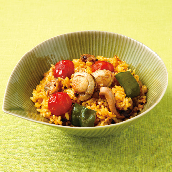 炊飯器で作る地中海料理「パエリアの素」。帆立、イカ、あさりなどの魚介や野菜を特製のスープとともに調製いたしました。