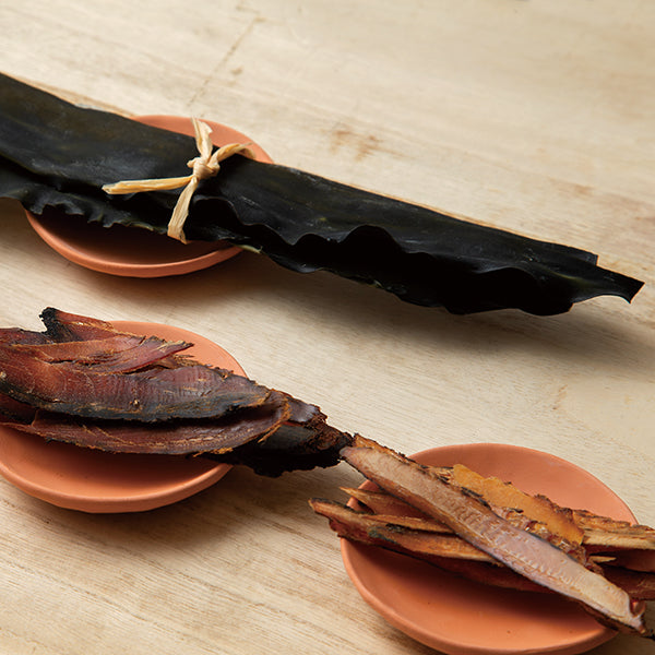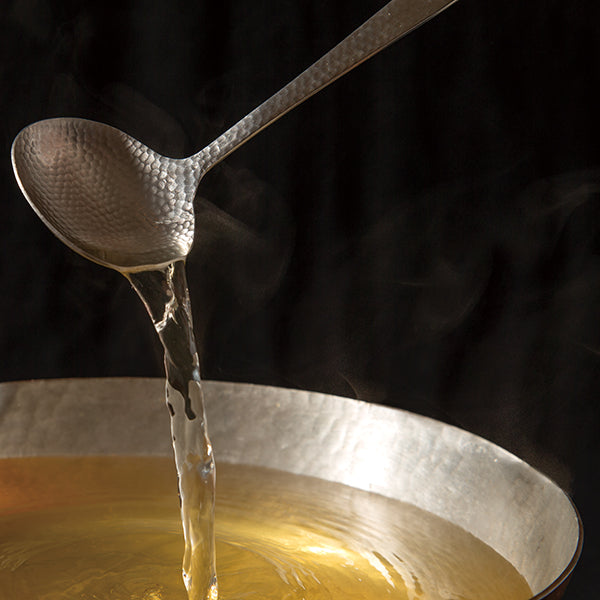 ご飯の炊き出汁には、鰹、鯖など数種の魚介節を 試行を重ねブレンドして煮出した琥珀(こはく)の出汁。