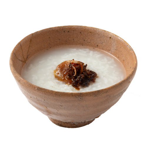 縁起米の基本の朝かゆに、伊勢志摩XO旨味オイルと貝柱をのせていただきます。
