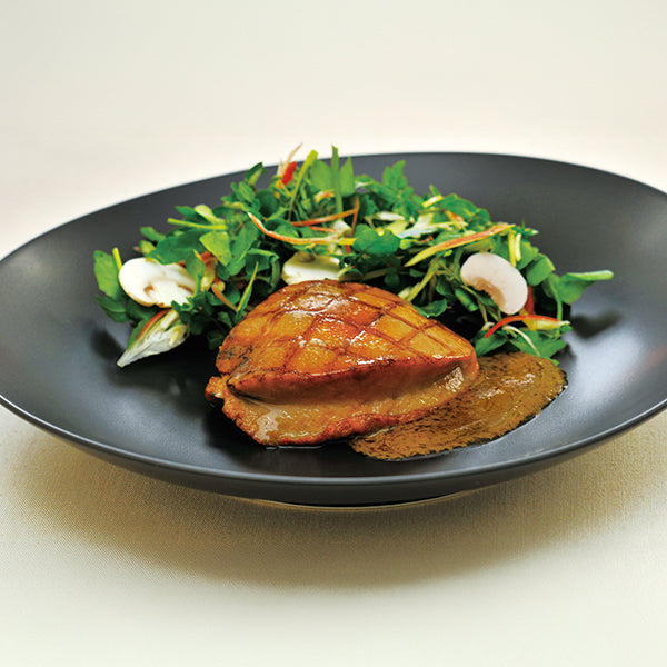 国産の天然黒鮑を湯にくぐらせたのち、表面を焼き上げてステーキに仕上げ、急速冷凍いたしました。
